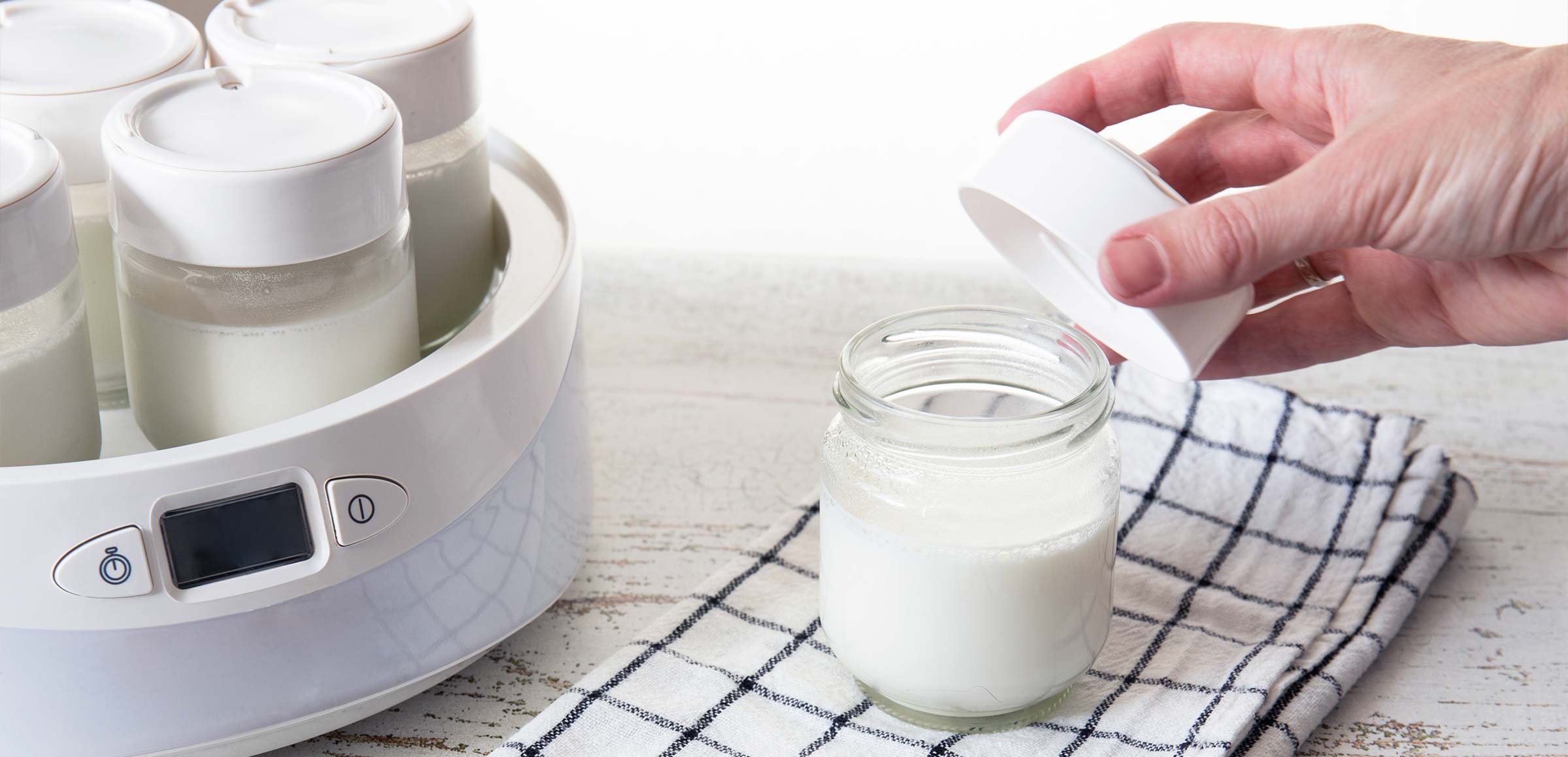 La iogurtera no és res més que una plataforma que et permet situar potets de vidre a l'interior, que has d'omplir, almenys, de llet i ferment (segons la recepta). La iogurtera es tanca i aplica una calor determinada de manera constant durant el temps necessari perquè el bacteri fermenti la llet.